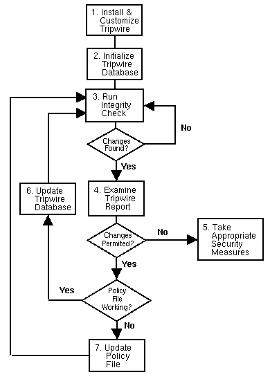 To change the list of files Tripwire monitors or how it treats integrity violations, update the supplied policy file (/etc/tripwire/twpol.txt), regenerate a signed copy (/etc/tripwire/tw.pol), and update the Tripwire database. For more information, see Section 19.8 Updating the Tripwire Policy File.