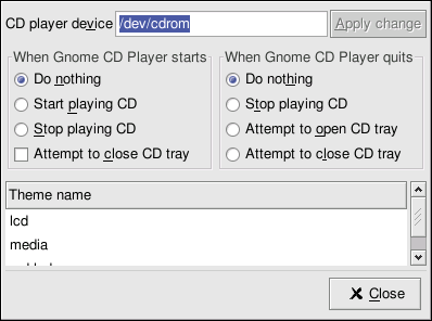 You can edit the track listings for your CDs by clicking the Open track editor button. You can also change the way the application functions by clicking on the Open Preferences button. Here you can set themes for the player as well as set the behavior of the CD-ROM drive when you open or quit the CD Player application.