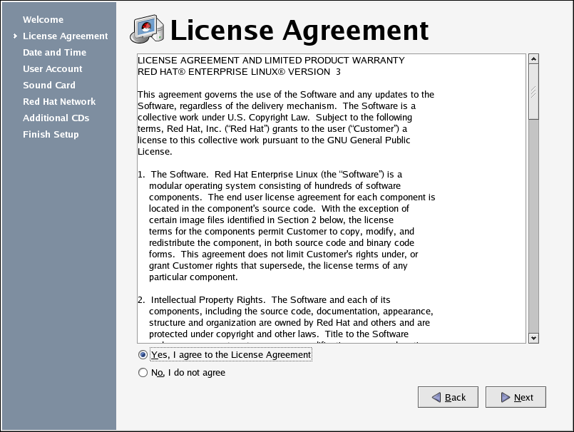You must agree to the License Agreement to continue using Red Hat Enterprise Linux. If you choose No, I do not agree at the License Agreement screen, the machine prompts you to either re-read the agreement or decline and shutdown your system. You cannot use Red Hat Enterprise Linux without first agreeing to the License Agreement.