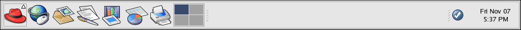 Panel: A desktop toolbar, usually located across the bottom of your desktop (such as Figure 1-8). The panel contains the Main Menu button and shortcut icons to start commonly used programs. Panels can also be customized to suit your needs.
