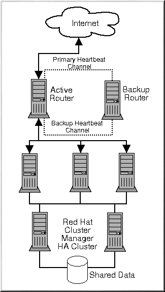 This configuration is ideal for busy FTP servers, where accessible data is stored on a central, highly available server and accessed by each real server via an exported NFS directory or Samba share. This topography is also recommended for websites that access a central, highly available database for transactions. Additionally, using an active-active configuration with Red Hat Cluster Manager, administrators can configure one high-availability cluster to serve both of these roles simultaneously.
